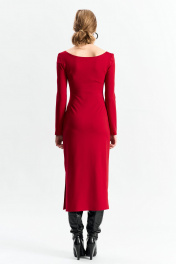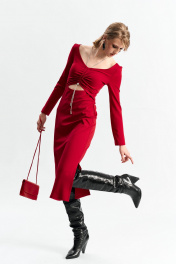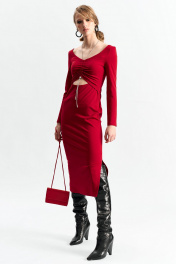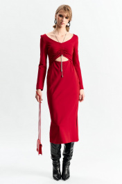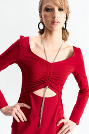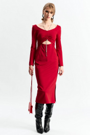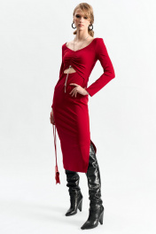 Платье прилегающего силуэта с подрезом в области талии и декоративным шнуром со стразами с затяжкой по груди .