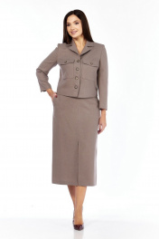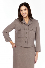 Костюм женский состоящий из жакета и юбки. Жакет приталенного силуэта на подкладке спереди, со втачным рукавом длины ¾. Имеет отложной воротник с лацканами, по переду застежка на петли и пуговицы, на груди накладные карманы с клапанами, которые застегиваются на петлю и пуговицу. Юбка длинная, трапециевидная, с разрезом по переду, на подкладке. На передней половинке карманы-хулиганы. Пояс фиксированный, застёжка слева, на молнию, петлю и пуговицу. Жакет: длина жакета по спинке – 49 см, длина рукава – 54 см. Юбка: длина по боковому шву – 87 см.