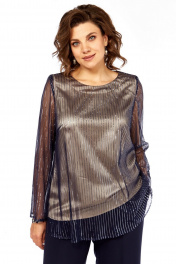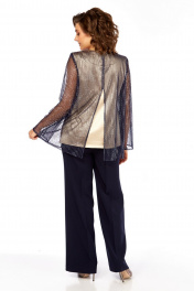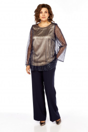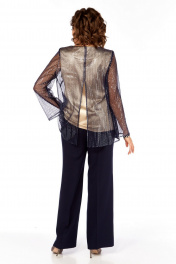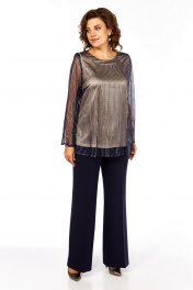 Костюм праздничный брючный. Состоит из блузы и брюк. Блуза двухслойная. Горловина округлая, вытачки по груди, рукава верхнего слоя втачные, на спинке шов в котором обработан разрез. Брюки прямого силуэта, со стрелками, пояс притачной по талии на резинке от бокового шва, с застежкой на тесьму-молнию и пуговицу, по переду имеются действующие карманы-хулиганы. Блуза: плечевой шов - 9 см, длина рукава - 62, длина изделия по спинке топа - 64 см, блузы - 72 см. Брюки: длина по бок. шву - 112 см.