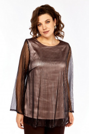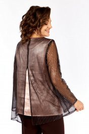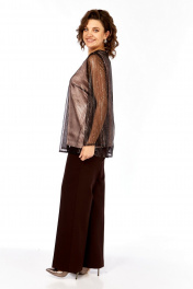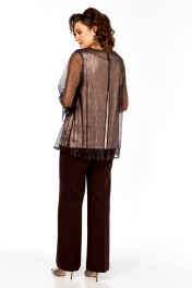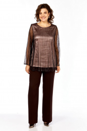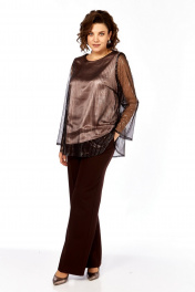 Костюм праздничный брючный. Состоит из блузы и брюк. Блуза двухслойная. Горловина округлая, вытачки по груди, рукава верхнего слоя втачные, на спинке шов в котором обработан разрез. Брюки прямого силуэта, со стрелками, пояс притачной по талии на резинке от бокового шва, с застежкой на тесьму-молнию и пуговицу, по переду имеются действующие карманы-хулиганы. Блуза: плечевой шов - 9 см, длина рукава - 62, длина изделия по спинке топа - 64 см, блузы - 72 см. Брюки: длина по бок. шву - 112 см.