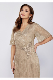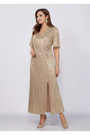 Элегантное, женское платье полуприлегающего силуэта, выполнено из плиссированной ткани с пайетки, на трикотажной подкладке. Лиф платья отрезной по линии талии и декорирован аппликацией, горловина V-образной формы, обработана подкладкой. Юбка платья расклешенная к низу, на подкладке, с разрезом по одной стороне. Спинка выполнена из основной ткани, с подрезом по спинке, рукав втачной, укороченный. Элегантное женское платье идеально для любого мероприятия! в 52р. Ширина груди- 53см, Ширина талии -47см, Ширина бедер- 58см, длина рукава- 29см., ширина рукава 22см.