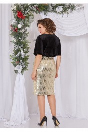 Эффектное платье, полуприлегающего силуэта, выполнено из велюра и пайеток. Лиф платья отрезной по линии талии, выполнен из велюра. По линии плеча выполнены кокетки из велюра, горловина с эффектом «качели». Юбка платья выполнена из пайеток, на трикотажной подкладке. Рукав втачной, расклешенный, выполнен из велюра. Спинка идентична полочке. В качестве декора съемная брошь, эффектное и стильное платье для ярких женщин! в 52р. Ширина груди- 53см, Ширина талии -47см, Ширина бедер- 58см, длина рукава- 47см, ширина рукава 19см.