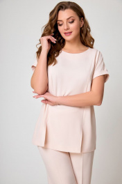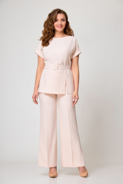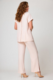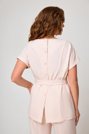Костюм состоит из блузки и брюк. Блузка с рельефами выходящими из плеча и декоративными разрезами по низу. Спинка с застежкой на петли и пуговицы. Рукав короткий цельнокроеный с манжетой по низу. Брюки с застежкой в боковом шве и разрезами по низу. Изделие дополняет пояс с пряжкой. Длина блузки 70 см,длина рукава от горловины 22 см. Длина брюк 104 см