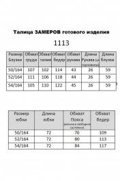 Комплект состоит из блузки и юбки. Блузка с кокеткой по переду и цельнокроеным рукавом с отложной манжетой. По кокетке, юбке и поясу декоративная вставка из отделочной ткани. Кокетка декорирована печатью выполненной методом шелкографи. Юбка классическая на подкладке слегка зауженная к низу. По верху юбки пояс с резинкой по бокам, застежка на потайную молнию и петлю с пуговицей в среднем шве заднего полотнища. Длина блузки 59 см, длина рукава от горловины 26 см, длина юбки 71 см