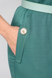 Платье с V-образным вырезом горловины и цельнокроеным рукавом. По переду средний шов переходящий в разрез и карманы вблизи бокового шва с клапаном. Спинка с талевыми вытачками и средним швом. По низу рукава манжета. В комплект входит ремень. Длина платья 108 см, длина рукава от горловины 47 см.