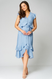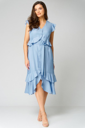 Невероятно романтичное, струящееся, легкое платье полуприлегающего силуэта выполнено из тонкого джинса. V-образный вырез горловины, застежка на 9 пуговиц и петель. Отрезное чуть выше талии. По переду и по спинке талевые вытачки. Спинка со средним швом От подреза идут ассиметричные воланы 1 по лифу и 2 по юбке. Рукав-крылышко. Имеется съемный пояс.
