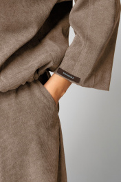 Комплект женский 2-ух предметный, состоящий из жакета и юбки. Жакет со спущенной линией плеча и цельнокроеным рукавом. По переду отрезная кокетка, воротник- стойка, рукава и планки. По переду настрочены нагрудные клапаны. Синка со средним швом. На левом рукаве о низу настрочена нашивка. Центральная застежка по планкам на 5 пуговиц и петель. Низ жакета можно регулировать с помощью эластичного шнура и фиксатора. Жакет без подкалки. Юбка на широкой обтачке А- силуэта, на подкладке. По переднему и заднему полотнищу заложены складки. По бокам расположены наклонные карманы. Застежка сзади на потайную тесьму-молнию.