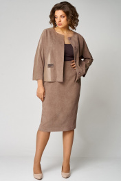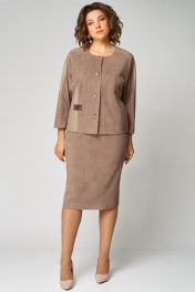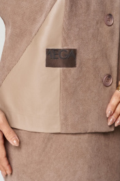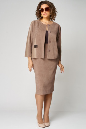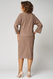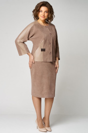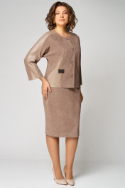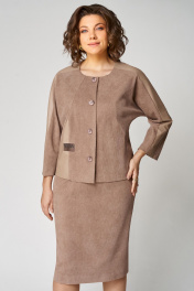 "Костюм состоит из жакета и юбки. Жакет полуприлегающего силуэта, с цельнокроеным рукавом длиной 7/8. От плеча до низа рукава отделочная вставка из эко-кожи. По переду- фигурные наклонные рельефы. По правой стороне вставка из эко-кожи, настрочена нашивка контрастного цвета. Застёжка центрально-бортовая на 4 петли и 4 пуговицы. Юбка прямая, слегка зауженная к низу, на притачном поясе, по бокам с резинкой. Застёжка на 1 петлю и 1 пуговицу, и потайную молнию сзади в среднем шве, по низу шва разрез. Юбка на подкладке. "