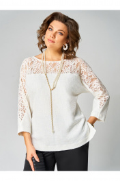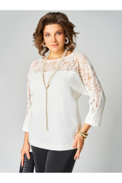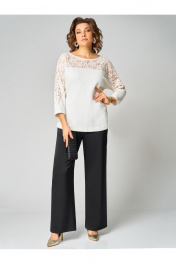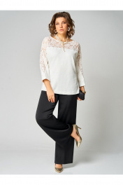 Комплект женский двухпредметный, состоящий из туники и брюк. Туника выполнена из трикотажного полотна. Округлый вырез горловины обработан бейкой. По переду и по спинке отрезная деталь и цельнокроеный рукав из кружева. Спинка со средним швом, по бокам разрезы. Длина рукава от горловины – 57 см, длина спинки - 66 см. Брюки прямые из сатина. Длина брюк по боковому шву без пояса – 104 см. Брюки на поясе, по бокам резинка и косые карманы.