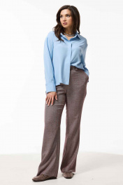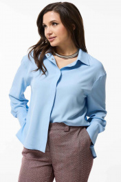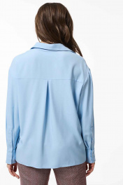 Блуза женская свободного силуэта с центральной застежкой на потайные кнопки. Рукав втачной, рубашечного типа с притачной манжетой на кнопке. По спинке отрезная кокетка, от екоторой по центру идет встречная складка. Воротник с отрезной стойкой. Низ изделия разноуровлевый, в боковых швах разрезы.