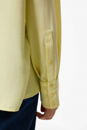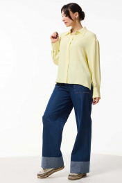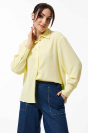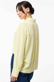 Блуза женская свободного силуэта с центральной застежкой на потайные кнопки. Рукав втачной, рубашечного типа с притачной манжетой на кнопке. По спинке отрезная кокетка, от екоторой по центру идет встречная складка. Воротник с отрезной стойкой. Низ изделия разноуровлевый, в боковых швах разрезы.