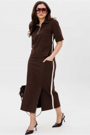 Костюм женский, состоящий из джемпера и юбки. Джемпер свободного силуэта. Перед с нагрудными вытачками. Вдоль боковых швов настрочена отделочная тесьма. Рукав до локтя одношовный, втачной. По переду частичная застежка на тесьму-молнию. Воротник стоячий отложной. Юбка прямого силуэта, с рельефами по переду, заканчивающимися шлицами. По бокам переда обработаны карманы. Спинка со ср. швом и застежкой на тесьму-молнию. По бокам Юбки настрочена отделочная тесьма. Юбка на подкладке. Верх обработан притачным поясом.