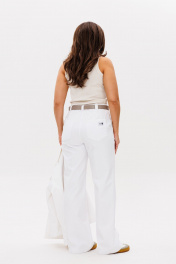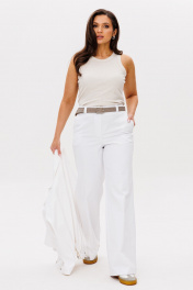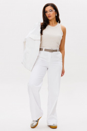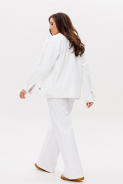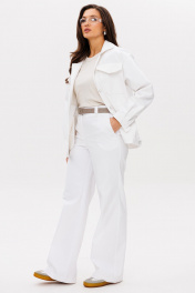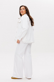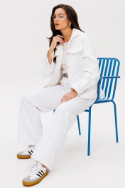 Костюм женский свободного силуэта состоит из жакета и брюк. Легкий белоснежный джинс. Жакет со спущенными плечами застёгивается на шесть прорезных петель и пуговиц. По переду прорезные карманы с широкой листочкой и накладные карманы с фигурными клапанами на застёжке. Воротник отложной. Рукава одно шовные втачные на манжете. Брюки прямые, с высокой посадкой на притачном поясе со шлевками. На спинке в пояс вставлена резинка. Застежка на молнию с гульфиком и откоском. Костюм выполнен из тонкого джинса.