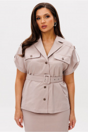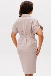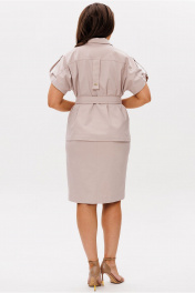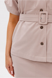 Комплект женский полуприлегающего силуэта состоит из жакета и юбки. Жакет со спущенными рукавами и патами. Перёд жакета с кокетками, накладными карманами с клапанами на застёжках металлических пуговицах. Воротник отложной на стойке с лацканами классической формы. По спинке кокетка и приточная пата с декоративной нашивкой. Юбка, зауженная к низу, на обтачке. Перёд с талевыми вытачками и центральным швом, который заканчивается разрезом. По заднему полотнищу талевые вытачки, центральный шов и застёжкой на потайную тесьму-молнию. От выточек до бокового шва вставлены резинки. Юбка на тонкой трикотажной подкладке. Украшает костюм отделочные строчки. Дополняет костюм пояс с пряжкой.