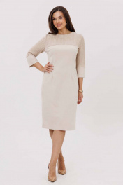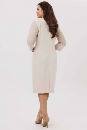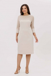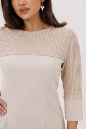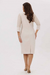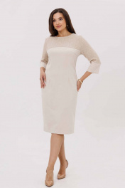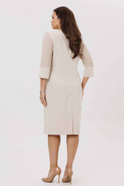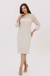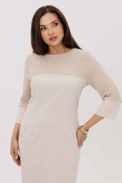 Платье полуприлегающего силуэта. Перед с отрезной кокеткой из отделочной ткани и с нагрудными и талиевыми вытачками. Спинка со средним швом, в который вставлена тесьма-молния). На спинке талиевые вытачки. Средний шов заканчивается шлицей.Рукав одношовный втачной из отделочной ткани с притачным манжетом из основной ткани.