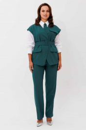 Комплект женский, состоящий из жилета и брюк. Жилет полуприлегающего силуэта, без подкладки. Плечо спущенное.Вырез V - образный, с воротником стойкой. По переду иммитация карманов с клапаном. Центральная застежка на пришивные кнопки. Спинка со средним швом и вытачками. Блуза женская, прямого силуэта с потайной застежкой. Перед с нагрудными вытачками. Спинка с отрезной кокеткой. Воротник рубашечного типа, с отрезной стойкой. Рукав тачной, одношовный, с манжетой по низу. Низ фигурный. Галстук на резинке. Брюки прямого силуэта, слегка зауженные к низу. Пояс частично на резинке (по бокам), с шлевками для ремня. Застежка на гульфик с молнией и пуговицей. По бокам карманы с косым входом. Материал костюма костюмный, средней плотности, с гладкой фактурой. Без подкладки. Дополняет модель широкий пояс.