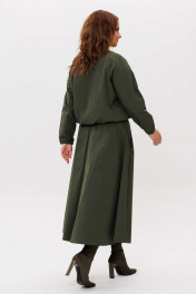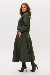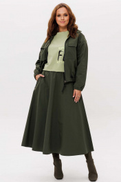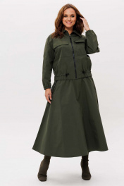 Костюм женский состоит из жакета и юбки выполнены из плащевой ткани. Жакет свободный со спущенными плечами на подкладке, по низу притачная планка, в которую продета резинка. По переду накладные карманы с клапанами. Воротник отложной. Рукава одношовные втачные по низу резинка. Юбка расклешённая, по талии притачной пояс в который продета тесьма резинка. По переду прорезные карманы на застёжках молния. По спинке центральный шов. Юбка без подкладки.