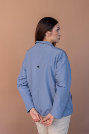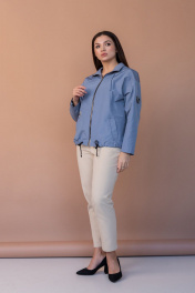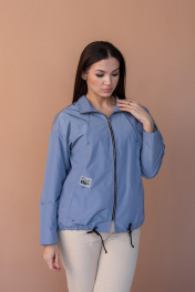 Куртка женская свободного силуэта, на подкладке, со спущенным плечом, выполнена из плащевой ткани. По переду косые подрезы, карманы, сверху застёгиваются на потайную молнию и карманы с листочкой снизу. Спинка с центральным швом. Воротник стойка. Рукава одно шовные втачные. Низ куртки затягивается шнуром