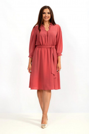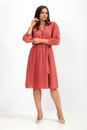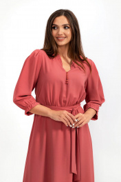 Платье женское полуприлегающего силуэта, отрезное по линии талии, на тонкой резинке, расклешённое к низу, выполнено из тонкой плательной ткани. Лиф переда на застёжке на 7 воздушных петель и пуговиц. По спинке центральный шов. Горловина V-образная с небольших рюшей. Рукава одно шовные втачные, свободные, по окату встречные складки, по низу резинка. Платье дополняет пояс. Платье на тонкой трикотажной подкладке.
