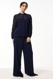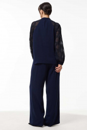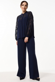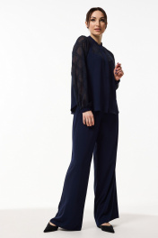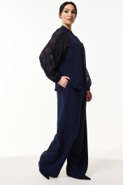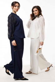 Костюм женский свободного силуэта состоит из блузы и брюк. Блуза, комбинированная из двух различных по фактуре тканей. По переду приточная планка и потайная застёжка на петли и пуговицы. Боковые швы заканчиваются небольшими разрезами с закруглёнными карманами. Воротник стойка. Рукава реглан, низ на резинке. Брюки свободные, расклешённые от бедра с высокой посадкой на притачном поясе. По спинке талевые вытачки. По бокам в пояс вставлена эластичная тесьма резинка. В брюках боковые функциональные карманы.