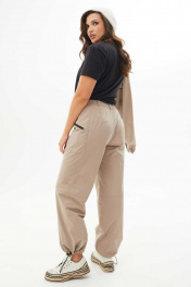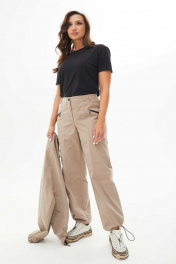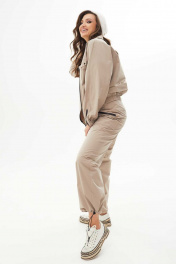 Костюм женский состоит из жакета и брюк выполнены из плащевой ткани. Жакет свободный со спущенными плечами на подкладке, по низу притачная планка, в которую продета резинка. По переду накладные карманы с клапанами. Воротник отложной. Рукава одношовные втачные по низу резинка. Брюки карго свободные, на притачном поясе, на резинке, с горизонтальными и вертикальными подрезами. По переду застёжка потайная тесьма молния с гульфиком и откоском, прорезные карманы, которые застёгиваются на молнии контрастного цвета. Ширина низа брюк регулируется тесьмой с фиксатором.