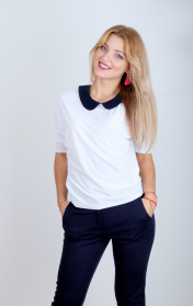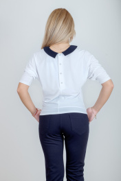 Длина изделия: 55 см Длина рукава: 37 см Блуза летучая мышь, зауженный рукав 3/4. Декоративная застежка-кнопки по спинке. Плосколежащий фигурный воротник.