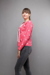 Длина изделия: 56 см Длина рукава: 57 см Блуза розового цвета в звезды, прямого силуэта. Застежка планка с декоративной шнуровкой. Длинный полуспущенный рукав