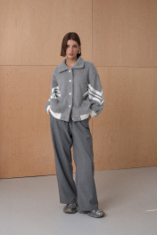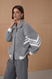 Джемпер из мягкого фактурного трикотажного полотна. Джемпер в силуэте олимпийки. Застежка на премиальные итальянские пуговицы. На рукавах декоративные ленты в виде лампасов. Длина от плечевой точки у основая шеи 64 см. Состав 100% ПЭ
