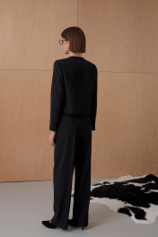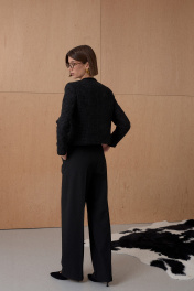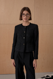 Жакет укороченной формы из благородного жаккарда. Декорирован мерцающей тесьмой. На подкладке. Длина от плечевой точки у основая шеи 52 см. Длина рукава от воротника 76 см. Состав 80% ПЭ, 18% вискоза, 2% спандекс