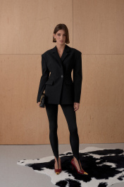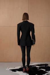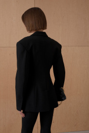 Жакет из формообразующей костюмной ткани. Усиленная и расширенная форма плеча. Приталенный. Двубортный. Длина от плечевой точки у основая шеи 76 см. Состав 80% ПЭ, 18% вискоза, 2% спандекс