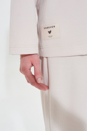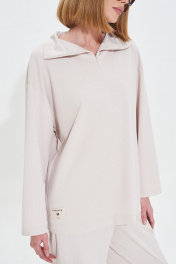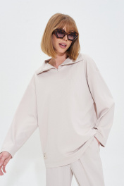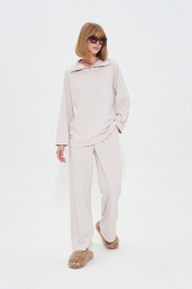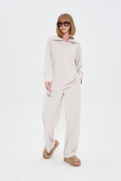 Комфортный костюм из мягкого трикотажного полотна. Джемпер с воротником на потайной молнии. Брюки широкие с поясом на резинке. Длина джемпера 70 Длина рукава от воротника 72 см Длина брюк 108