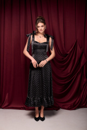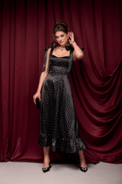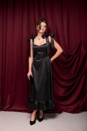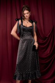 Платье из премиального атласа с блестящим принтом в мелкий бантик. Банты на шлейках съёмные. Молния по спинке. Чашки в лифе съёмные. Длина платья 133 см. 42 р-р ОГ 82-84 см, ОТ 69-71 см. 44 р-р ОГ 86-88 см, ОТ 73-75 см. 46 р-р ОГ 90-92 см, ОТ 77-79 см. 48 р-р ОГ 94-96 см, ОТ 81-83 см.
