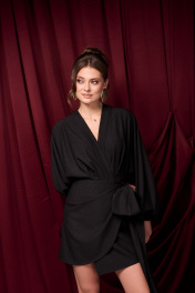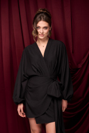 Платье из ткани с деликатным блеском. Платье на запАх, фиксируется на пуговицу и длинные ленты, которые можно подвязать красивым бантом. Длина платья 84 см.
