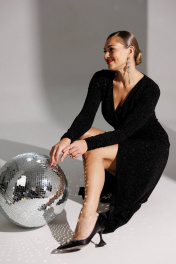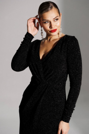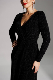 Блеск софитов, огни салютов, игривые пузырьки в бокале - и Ваше сияние обеспечено нашим вечерним платьем! Это действительно озорно, игриво, празднично! И, как ни крути, приковывает взгляды! Представленное платье приталенного силуэта. Спинка с талиевыми вытачками. Перед отрезной по линии талии. Лиф с эффектным V-образным вырезом и узлом в области талии. Юбка на запах. Рукав полуреглан, присборенный на резинку в нижней части (по шву). Платье на подкладке. Материал платья - тонкий трикотаж с блеском. Хорошо тянется. длина рукава (полуреглан): 68 см длина спинки: 143 см