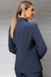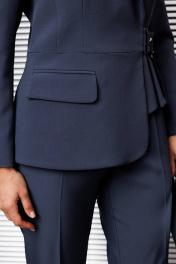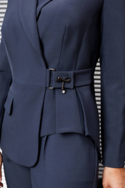 Двухпредметный комплект, который состоит из жакета и брюк. Жакет полуприлегающего силуэта с ассиметричной полочкой, на которой выполнен карман в рамку. Рукав втачной, двухшовный. Спинка со средним швом и талиевыми вытачками. Воротник пиджачной формы. Жакет на подкладке. Брюки прямые, по низу с манжетой, сверху на притачном поясе-кокетке, по бокам с карманами. Застежка на тесьму-молнию в среднем шве. длина жакета по спинке: 67,5 см длина рукава: 61 см длина брюк: 103 см