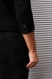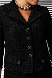 Костюм в стиле Шанель, состоящий из жакета и юбки, представляет собой элегантный и стильный ансамбль. Жакет полу прилегающего силуэта имеет центральную застежку на петли пуговицы, что придает ему изысканный вид. Спинка жакета оформлена средним швом, а передняя часть украшена талиевыми вытачками, заканчивающимися разрезами, над которыми аккуратно настрочены клапаны с пуговицами. Воротник пиджачного типа добавляет строгости, а рукава длиной 3/4 с шлицей в локтевом шве подчеркивают женственность образа. Юбка выполнена в прямом силуэте с эффектным разрезом по переду, который декорирован отделочной тканью «плиссе», придающей дополнительный шарм. Пояс юбки притачной с резинкой сзади обеспечивает комфортную посадку, а боковая молния облегчает надевание. Вся конструкция костюма выполнена на подкладке, что обеспечивает удобство и приятные тактильные ощущения. Такой костюм идеально подходит для офисной обстановки или деловых встреч, сочетая в себе классический стиль и современные акценты. длина жакета по спинке: 53 см длина рукава: 48 см длина юбки с поясом: 82 см