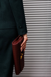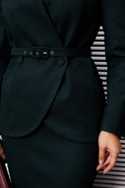 Жакет полуприлегающего силуэта с двухбортной застёжкой на одну пару обтяжных,из основной ткани, пуговиц и одной потайной. Край борта фигурной формы,придающей динамичность жакету. На полочке выполнены фигурные рельефы, которые дополнены функциональными карманами, гармонично вписывающимися в общую структуру изделия. Спинка со средним швом и вертикальными рельефами из проймы. Воротник с цельнокроенной стойкой, что придает жакету элегантный и строгий вид. Рукава двухшовные, со шлицей в локтевом шве на одну пуговицу,также обтяжную из основной ткани.Жакет дополнен шлёвками и съемным поясом из основной ткани с пятью блочками на обтяжную пряжку, чем придает дополнительный акцент на талии. Жакет на подкладке. Юбка, длиной ниже колена,зауженная к низу. Застёжка в левом боковом шве на потайную молнию и пуговицу. На переднем и заднем полотнище юбки обработаны талевые вытачки, которые обеспечивают точную посадку по фигуре. Юбка на поясе, сзади частично на резинке для удобства и комфортной посадки.В среднем шве юбки обработана шлица, которая обеспечивает свободу движений. Юбка, также на подкладке. Костюм выполнен из качественной костюмной ткани, что придает изделию прочность и долговечность, а также создает элегантный и современный образ, подходящий для различных деловых мероприятий и повседневной носки. длина жакета по спинке: 63,5см длина рукава: 62 см длина юбки с поясом: 77,5 см