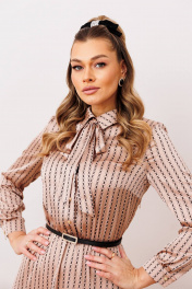 В нем все идеально: цвет, фактура, принт. Это платье точно не оставит никого равнодушным. А в сочетании с удлиненным базовым жакетом создает романтичный и стильный образ. Платье полуприлегающего силуэта с центральной бортовой застежкой до линии талии на петли-пуговицы. Воротник рубашечный. Рукав втачной, одношовный, с манжетой. Платье отрезное по линии талии, на резинке. Нижняя часть А-силуэта. Застежка на тесьму-молнию в боковом шве. Дополнением к платью является съемный пояс, который позволяет регулировать линию талии. Декором данного лука является бант, который придаст Вашему образу романтики. длина спинки: 135 см длина рукава: 63см