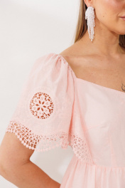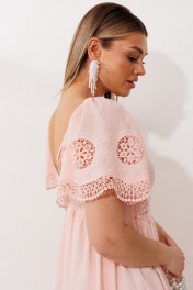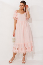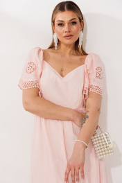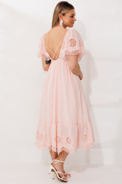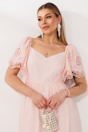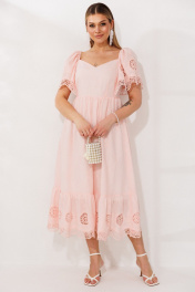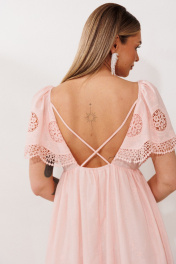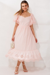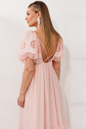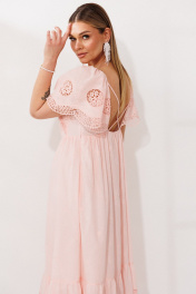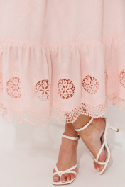 В этом платье читается нежность. Оно сшито из дышащей хлопковой ткани. Воздушные рукава, присборенные по окату эластичной резиной, можно носить классически или спустить вниз, открывая линию плеч - это добавляет образу то трогательную застенчивость, то расслабленную романтику. Лиф с глубоким V-образным вырезом мягко очерчивает силуэт, а открытая спинка, которую удерживают лишь две тонкие бретели, дарит ощущение прохлады и беззащитной красоты. От линии талии начинается свободная юбка, лежащая мягкими фалдами благодаря воздушной сборке. Она уходит в пол удлиненным силуэтом, а внизу её украшает притачная оборка, расшитая ажурным шитьём. Под всей этой лёгкой конструкцией скрывается нижняя юбка из натурального хлопка: она даёт форме нужный объём, не позволяя основному полотну просвечивать. Мелкие стежки шитья на рукавах и подоле звучат как деликатная ручная работа, превращая простую ткань в историю, которую хочется рассматривать.