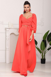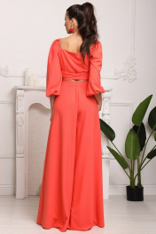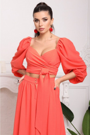 Ультрамодный комплект, состоящий из кроп-топа и юбки-брюк. Укороченный кроп-топ на запах с завязками вокруг талии с открытой спиной и зоной декольте. Объемные фантазийные рукава с резинкой в верхней части, что позволяет, по желанию, открыть плечи, и по низу. Юбка-брюки с завышенной талией. Сборка у пояса по передним половинкам. Застежка в среднем шве. Юбка-брюки на притачном поясе с резинкой сзади. длина по спинке: 20 см длина рукава: 59 см длина брюк: 115 см