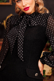 Платье прилегающего силуэта, с накладными декоративными клапанами по переду. Рукав одношовный, со сборкой по низу и на манжете, сборка по верхней части рукава. Рукав, кокетка переда и спинки, воротник-бант выполнены из ткани шифон в горошек. Воротник-бант декоративный , с длинными хвостами. По задней половинке с талиевыми вытачками и шлицей. длина спинки: 101 см длина рукава: 66 см