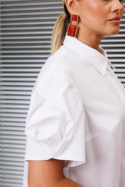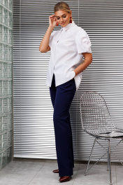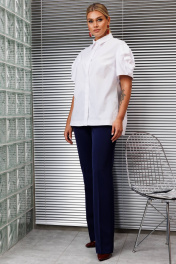 В модный базовый гардероб рубашка должна входить по умолчанию. Рубашка с коротким рукавом не менее универсальная, чем стандартная. Классический прямой силуэт легко комбинируется с любым низом. Нейтральная палитра цветов делает рубашку незаменимой для создания монохромных и контрастных образов. Акцентом в данной модели является объемный цветок на рукавах. По переду - центральная потайная застежка на петли-пуговицы. По спинке кокетка и вертикальные, глубокие складки. Низ фигурный с перепадом длины. Линия плеча спущена. длина спинки: 61 см длина рукава: 25 см
