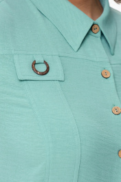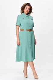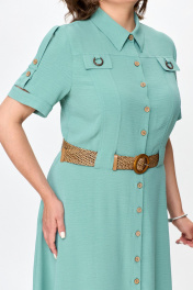 Платье женское без подкладки, центральная застежка ввиде планки застегивается на петли и пуговицы. Перед и спинка отрезные по линии талии. На верхней части переда располагается кокетка, от нее идет рельеф, по шву рельефа настрочена отделочная деталь переходит на нижнюю часть переда, внизу служит ввиде шлевки. По шву кокетки на отделочной деталью пришит клапан, по центру него шлевка с украшением. На верхней части спинки располагается кокетка, от нее идут рельефы. По линии талии спинки на уровне рельефов пришиты шлевки. Нижняя часть спинки со средним швом. Воротник стояче-отложной с притачной стойкой. Боковые карманы в швах. Рукав одношовный, втачной, по низу обработан закругленный вырез, притачная манжета. По центру рукава, в шов проймы и выреза вставлены паты, закреплены двумя пуговицами, между ними пришита на рукав шлевка. В дополнении ремень. Длина изделия 116см, рукав 24см.