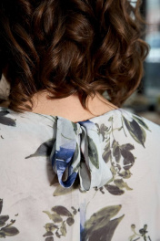 Платье женское прямого силуэта, на подкладке, тесьма-молния в левом боковом шве. Перед с диагональными подрезами: начинается слева от проймы до правого бокового шва, 5 ярусов, соединены по верхнему срезу с подкладкой, низ отлетной. Спинка со средним швом, без вытачек. Рукав втачной, одношовный. Горловина форма лодочка, по горловине спинки пришиты завязки, завязаны на бантик. Длина изделия 102см, рукав 19см.