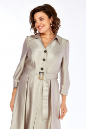 Платье женское полуприлегающего силуэта, расширенное к низу, без подкладки, лиф переда с центрально бортовой застежкой, застегивается на петли и пуговицы, тесьма-молния в левом боковом шве. Перед и спинка отрезные по линии талии. Верхняя часть переда с рельефами от проймы. На нижней части переда встречные складки на уровне рельефов, по центру заложена складка, закреплена отделочной складкой, до уровня бедер. Верхняя часть спинки с талиевыми вытачками. На нижней части спинки встречные складки на уровне талиевых вытачек, средний шов. На уровне линии талии по боковому шву настрочены шлевки, для пояса. Горловина спинки обработана обтачкой. Горловина и край борта переда обработаны планками и подбортом. Воротник стояче отложной с отрезной стойкой. Рукав одношовный, втачной, свободный, окат присобран на сборку, по низу рукава заложены две складки, притачная манжета застегивается на петлю и пуговицу. В дополнении пояс из основной ткани, фиксируется пряжкой.