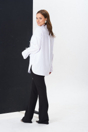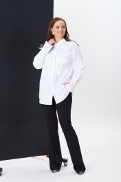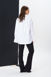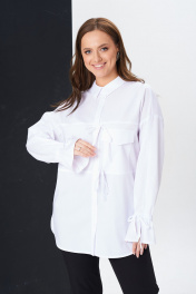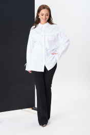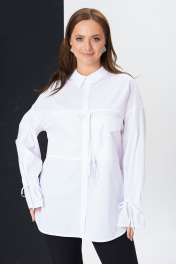 Стильная женская рубашка свободного кроя с рубашечным воротником и спущенной линией плеча. По переду планка на застежку петли пуговицы. Передние полочки разрезные по горизонтали с отделкой по швам. Левая полочка декорирована карманом с клапаном и шнурами завязывающимися в банты. Рукав в тачной двух шовный, в 12 см от низа рукава кулиса со втянутым в нее шнуром для затягивания. Спинка изделия с кокеткой и заложенной складкой. Низ рубашки фигурный с разрезами по боковым швам.