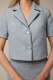 Комплект, состоящий из укороченного жакета и юбки-мини. Выполнен из костюмной ткани. Жакет прямого силуэта на подкладке. Застегивается на две петли и пуговицы. Перед с нагрудными вытачками, спинка со средним швом. Воротник классический пиджачный. Рукав короткий втачной двухшовный. Юбка силуэта трапеция на притачном поясе-кокетке, также выполнена на подкладке. Застегивается на потайную молнию в среднем шве спинки. По задней части юбки талиевые вытачки. У данной модели универсальная посадка на уровне линии талии