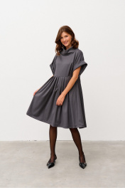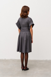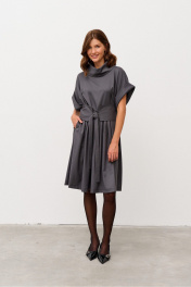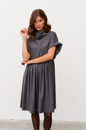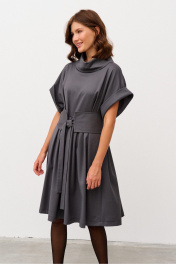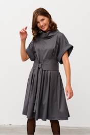 Платье свободного силуэта из костюмной ткани, отрезное по линии талии. Рукав спущенный с манжетой. Воротник - хомут. По лифу переда заложены складки, по юбке переда и спинки также заложены складки. В боковых швах выполнены карманы. Имеется съемный фигурный пояс.