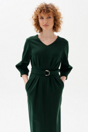 Платье со спущенной линией плеча, полуприталенного силуэта,зауженное к низу,из однотонной трикотажной ткани,длиной до середины икры. Спинка со средним швом с молнией,снизу разрез-шлица. По переду средний шов,по талии по два защипа. Рукав длиной 7/8,прямой объёмный,по низу застрочены глубокие защипы. Горловина платья с V-образным вырезом,обработана обтачками. В боковых швах карманы. К платью прилагается съёмный пояс-завязка на полукольцах.
