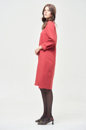 Платье прямого силуэта,длиной до середины колена. Спинка прямая со средним швом,сверху молния,полочка прямая без вытачек,короче спинки на 4 см,с отрезным бочком,в котором внизу разрез. Рукав длиной 7/8 покроя реглан,по низу передней части глубокая горизонтальная складка,по задней части и верхнему шву также заложены складки. Горловина круглая,обработана обтачками,в боковых швах карманы.